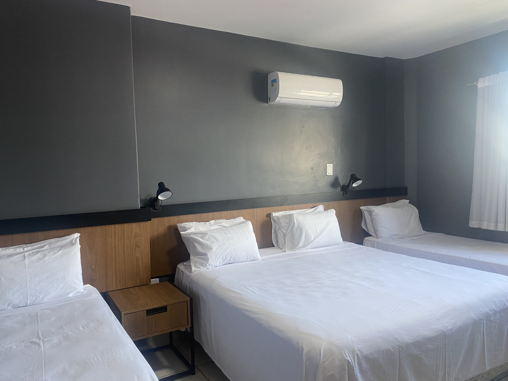 Categoria de acomodação que pode hospedar até 4 pessoas com conforto em camas de casal e camas de solteiro, contando com comodidades como ar-condicionado, TV, frigobar, wi-fi, armário e banheiro completo higiênica.